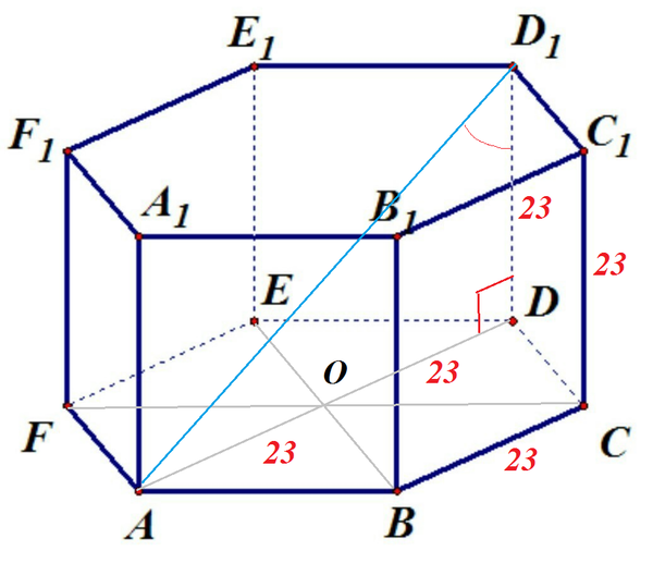 В правильной шестиугольной призме ABCDEFA1B1C1D1E1F1 все ребра равны 23. Найдите тангенс угла AD1D.