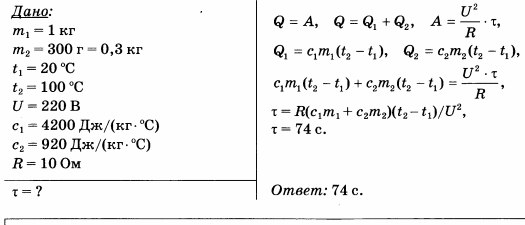 Электроплитка сопротивлением 10 Ом включена в сеть напряжением 220 В. Через какое время на этой электроплитке закипит вода массой 1 кг, имеющая начальную температуру 20 °С и налитая в алюминиевый ковш массой 300 г? Потерями энергии в окружающую среду пренебречь.