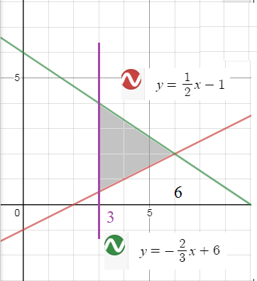 ∫ ^(6)_(3) (∫^((x/2)-1)_((-2x/3)+6) dy)dx= = ∫ ^(6)_(3) (y)|^((x/2)-1)_((-2x/3)+6)dx= =∫ ^(6)_(3)((x/2)-1 -((-2x/3)-6)dx= =∫ ^(6)_(3)((7x/6)+5)dx= определённый интеграл считаем самостоятельно...
