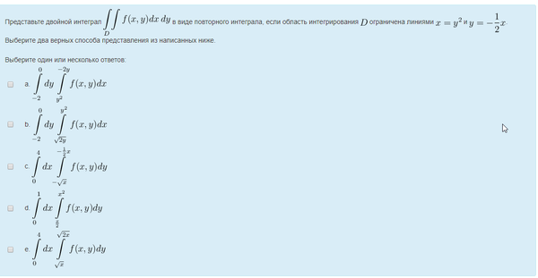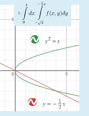 a) верно y=-(1/2)x ⇒ x=-2y -2< y <0 y^2< x < -2y и с) верно. x=y^2 ⇒ x= ± sqrt(y) Верхняя ветвь : x=sqrt(y) Нижняя ветвь : х=-sqrt(y) 0 < x < 4 Cм. рис.