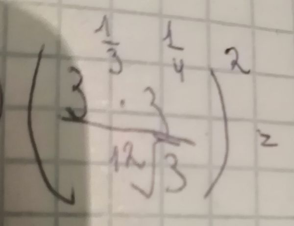 [m]\frac{3^{\frac{1}{3}}\cdot 3^{\frac{1}{4}}}{\sqrt[12]{3}}=(\sqrt{3})^2=3[/m]