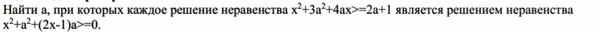 каждое решение неравенства x²+3a²+4ax≥2a+1 является решением неравенства x²+a²+(2x–1)a≥0