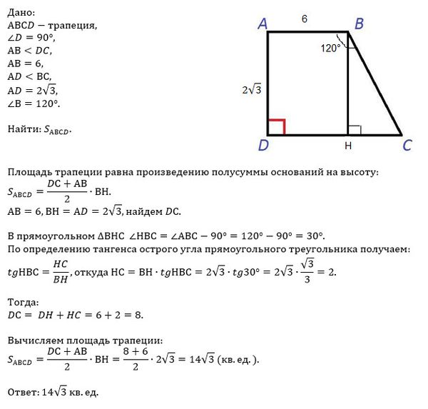 решите задачу по геометрии с дано и рисунком. Очень благодарен тому кто их решает. Не болейте ! В прямоугольной трапеции меньшее основание равно 6, а меньшая боковая сторона - 2√3. Найдите площадь трапеции, если один из ее углов равен 120°.