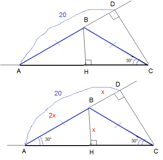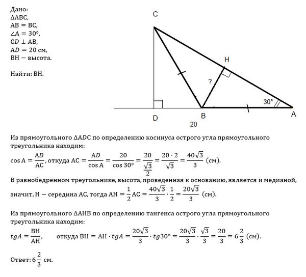 В равнобедренном треугольнике АВС (АВ = ВС) угол А = 30°. Найдите высоту, опущенную к основанию, если AD = 20 см (D принадлежит прямой АВ, а CD перпендикулярен АВ).
