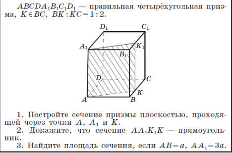 1. Постройте сечение призмы плоскостью, проходя-щей через точки A, A₁ и K.