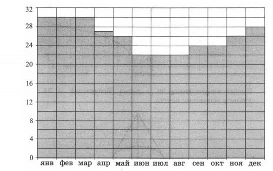 На диаграмме показана среднемесячная температура воздуха в Рио-Де-Жанейро за каждый месяц 2009 года.По горизонтали указываются месяцы,по вертикали температуры в градусах Цельсия. Определите разность между наибольшей и наименьшей среднемесячной температурой 2009 году.