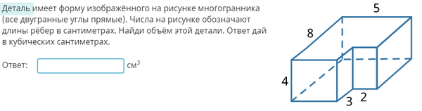 Деталь имеет форму изображённого на рисунке многогранника (все двугранные углы прямые). Числа на рисунке обозначают длины рёбер в сантиметрах. Найди объём этой детали. Ответ дай в кубических сантиметрах.