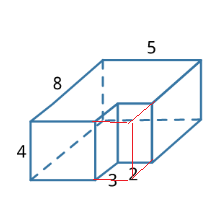 Достроим до полного параллелепипеда: И из объема полного вычитаем объем вырезанного V=5*8*4-3*2*4=160-24=[b]136[/b]