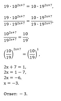 Корень уравнения 19 · 10^(2x+7) = 10 · 19^(2x+7) равен
