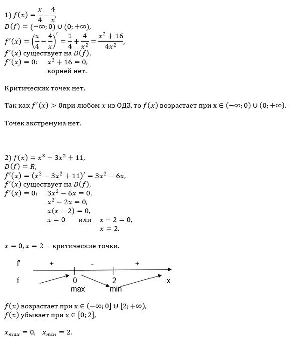 ПОМОГИТЕ ПОЖАЛУЙСТА Задание: для каждой функции : 1)Найти критические точки 2) определить промежутки возрастания и убывания 3) определить точки экстремума 1.f(x)=x/4–4/x; 2.f(x)=x3–3x2+11