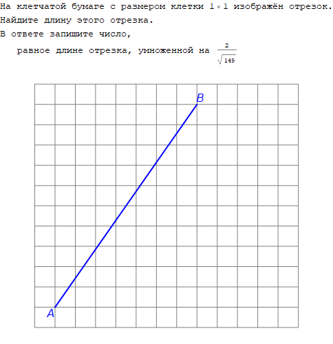 на клетчатой бумаге с размером клетки 1х1 изображен отрезок. Найдите длину этого отрезка. В ответе запишите число равное длине отрезка, умноженной на 2/√149