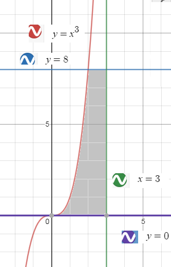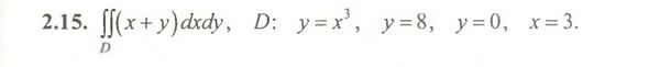 Область горизонтального вида: 0 ≤ y ≤ 8 ∛y ≤ x ≤ 3 = ∫ ^(8)_(0)dy ∫ ^(3)_(∛y)(x+y)dx= = ∫ ^(8)_(0) ((x^2/2)+yx)|^(3)_(∛y)dx= = ∫ ^(8)_(0)((9/2)-y∛y)dy= =(9/2)y|^(8)_(0)-(y^(7/3)/(7/3))|^(8)_(0)= =(9/2)*8-(3/7)*2^7=