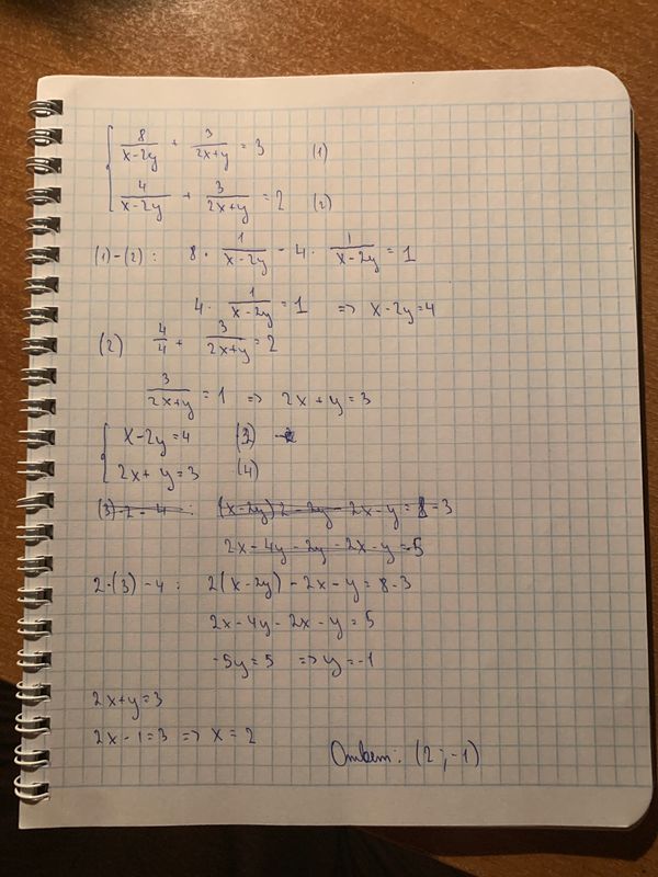 4. Решите систему уравнений: [m] \left\{ \begin{array}{l} \frac{8}{x - 2y} + \frac{3}{2x + y} = 3, \\ \frac{4}{x - 2y} + \frac{3}{2x + y} = 2; \end{array} \right. [/m]