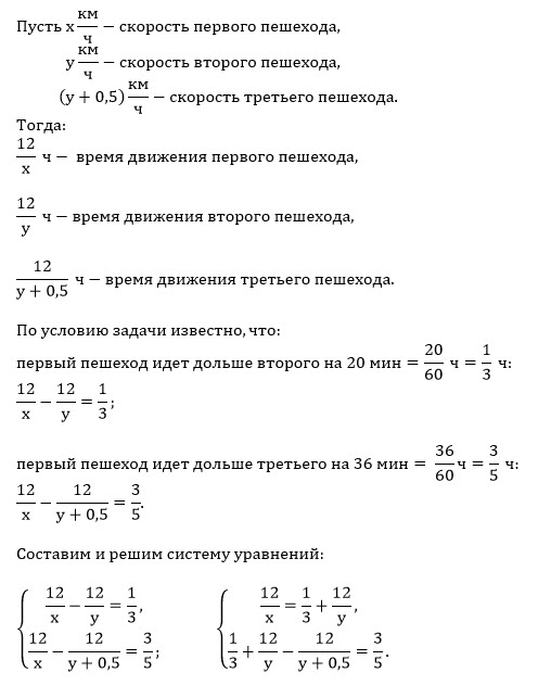 первый пешеход проходит на 20 мин дольше второго пешехода и на 36 мин дольше третьего.