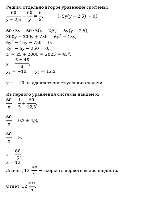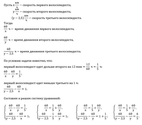 Расстояние между двумя пунктами 60 км первый велосипедист проезжает на 12 мин дольше второго велосипедиста и на 1 час быстрее третьего. Скорость третьего велосипедиста на 2,5 км/ч меньше скорости второго. Найти скорость первого велосипедиста.