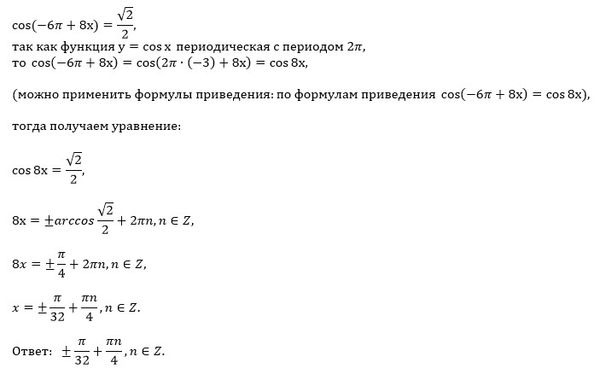 cos(-6π+8х)=cos(8x-6π) по свойству четности косинуса cos(8x-6π) =√2/2 ⇒ (8x-6π) = ± arccos(√2/2)+2πn, n ∈ Z (8x-6π) = ±(π/4)+2πn, n ∈ Z 8х=6π ±(π/4)+2πn, n ∈ Z [b]х=(1/8)*(6π ±(π/4)+2πn), n ∈ Z[/b]