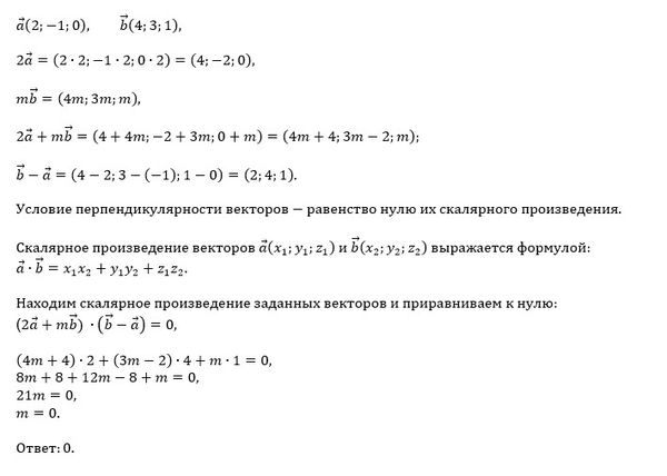 Даны точки a (2; -1; 0) b (4; 3; 1) при каком значении m,вектор 2a + mb перпендикулярен вектору b-a? Пожалуйста прошу помогите