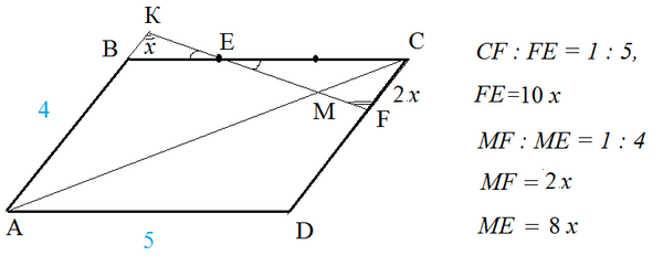 MF : МЕ = 1 : 4 ⇒ [b]MF=2x[/b], [blue]ME=8x[/blue] ⇒ Δ FCM - равнобедренный