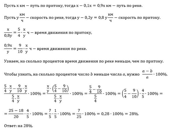 Моторная лодка спустилась вниз по реке, а потом поднялась вверх по притоку. Путь по реке на 10% меньше, чем по притоку, а скорость движения по притоку была на 20% меньше, чем по реке. На сколько процентов время движения по реке меньше, чем по притоку?