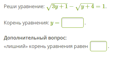 Реши уравнение: sqrt(3y + 1) - sqrt(y + 4) = 1.