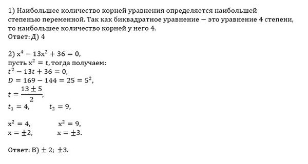 Решите пожалуйста с решением. Будут ещё задания заранее спасибо. №1. Какое наибольшее количество корней может иметь биквадратное уравнение? А) 3 В) 2 С) 5 Д) 4 №2. Решите биквадратное уравнение х4-13х2+36=0 А) ±3, ±4 В) ±2, ±3 С) ±4, ±5 Д) ±4