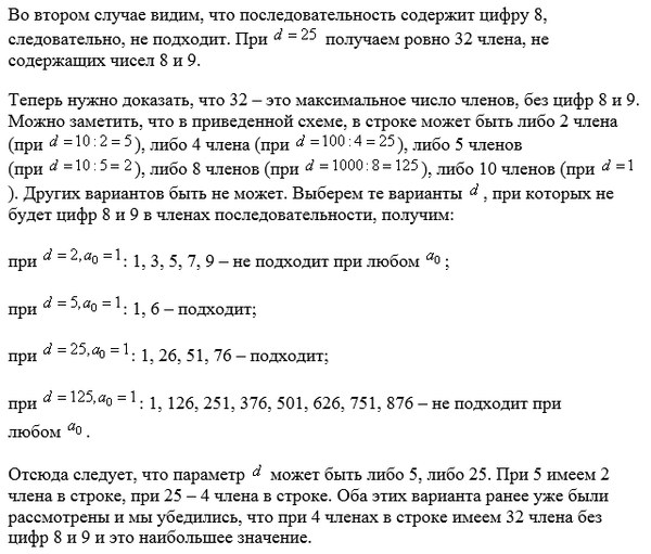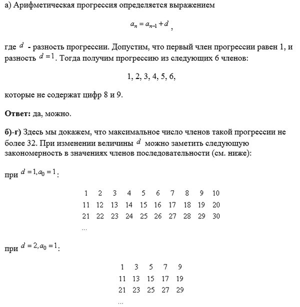 в) Докажите, что число членов всякой такой прогрессии не больше 32.