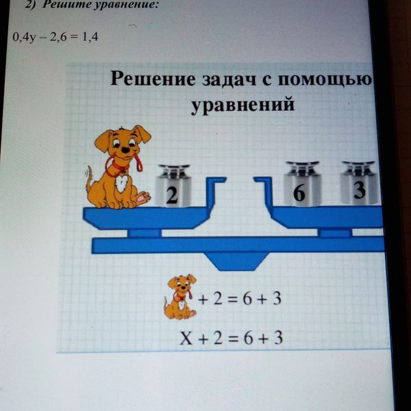 Пусть щенок весит х кг. Составим и решим уравнение: х+2=6+3, х+2=9, х=9-2, х=7. Значит, щенок весит 7 кг. Ответ: 7 кг. Решим уравнение: 0,4у-2,6=1,4, 0,4у=1,4+2,6, 0,4у=4, у=4:0,4, у=40:4, у=10. Ответ: 10.