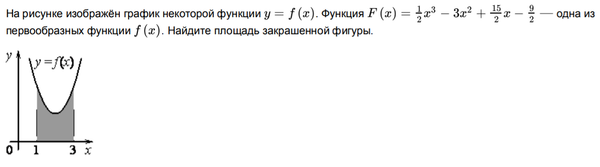 На рисунке изображён график некоторой функции y = f(x). Функция F(x) = 1/2 x^3 - 3x^2 + 15/2 x - 9/2 - одна из первообразных функции f(x). Найдите площадь закрашенной фигуры.