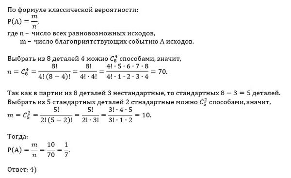 8. В партии из 8 деталей три нестандартные. Найти вероятность того, что среди 4 взятых наудачу деталей две стандартные. 1) 3/7 2) 0,4 3) 1/14 4) 1/7