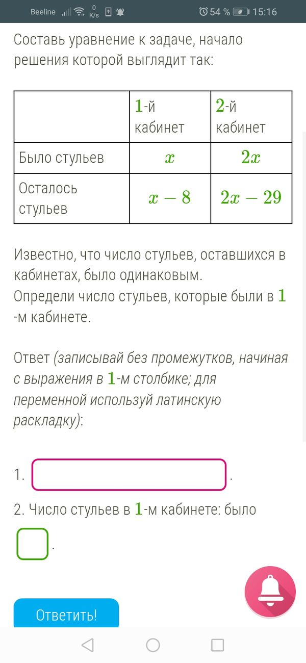 Составь уравнение к задаче, начало решения которой выглядит так: Известно, что число стульев, оставшихся в кабинетах, было одинаковым. Определи число стульев, которые были в 1-м кабинете.