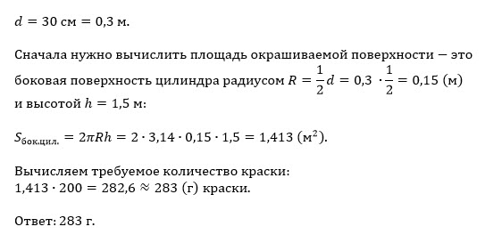 Для окраски 1м2 цилиндрической трубы необходимо 200 г краски. Сколько грамм краски нужно приобрести для окраски трубы длиной в 1,5 м диаметром 30 см?