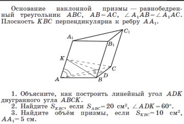 Основание наклонной призмы — равнобедренный треугольник ABC, AB=AC, ∠A1AB=∠A1AC. Плоскость KBC перпендикулярна к ребру AA1. 1. Объясните, как построить линейный угол ADK двугранного угла ABCK. 2. Найдите SKBC, если SABC=20 см², ∠ADK=60°. 3. Найдите объем призмы, если SKBC=10 см², AA1=5 см.