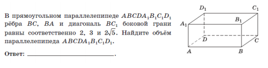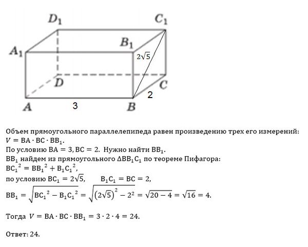 В прямоугольном параллелепипеде ABCDA1B1C1D1 рёбра BC, BA и диагональ B1C1 боковой грани равны соответственно 2, 3 и 2√5. Найдите объём параллелепипеда ABCDA1B1C1D1.