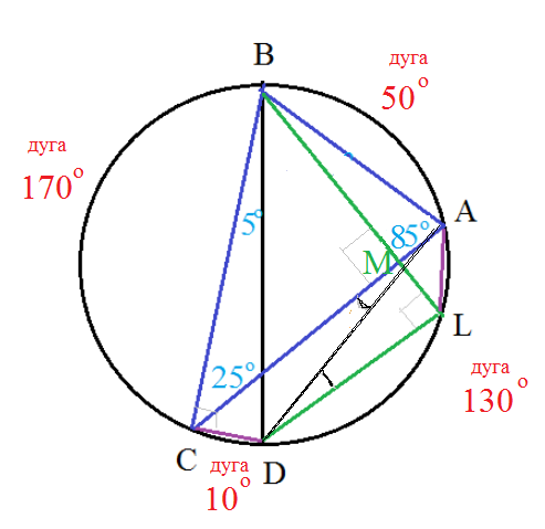 ∪ AB=50 ° ; ∪ BD=180 ° ⇒ [b] ∪ DLA=130 [/b](180 ° -50 ° )