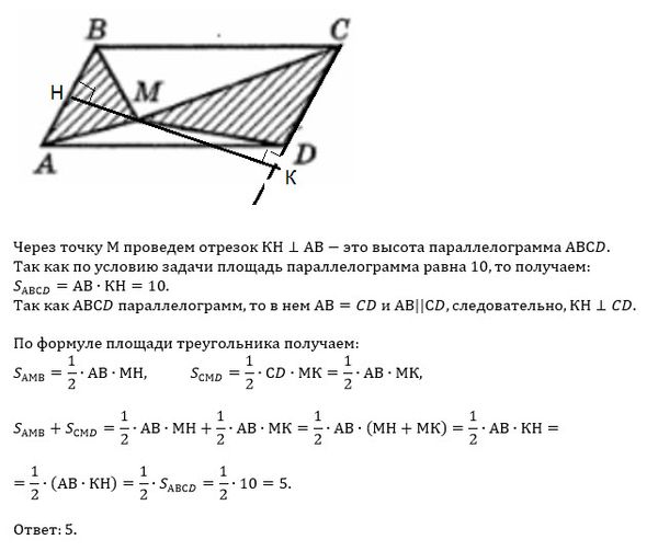 Значит, S_( Δ AMB)+S_( Δ CMD)=S_(АBCD)- S_( Δ ВMC)-S_( Δ AMD)=10-5=5