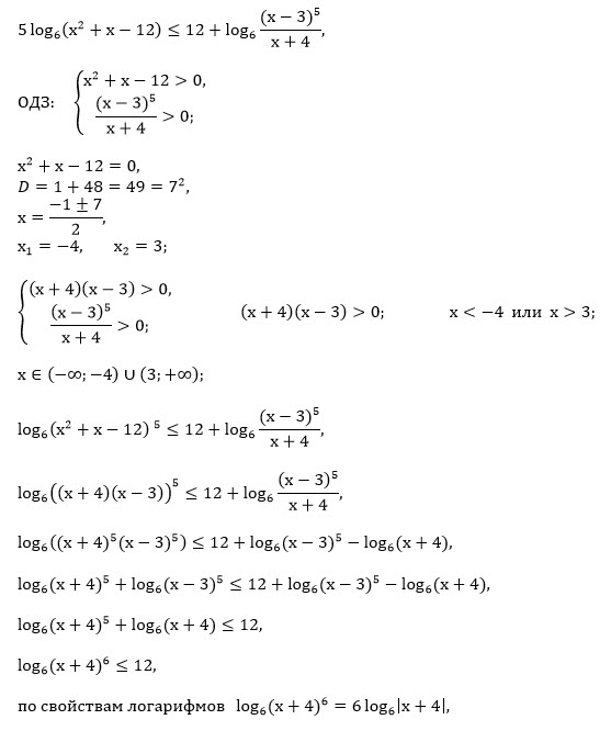 Решить неравенство 5 log6 (x^2 + x - 12) ≤ 12 + log6 ((x - 3)^5 / (x + 4))