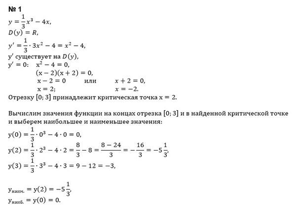 1)Найдите наибольшее и наименьшее значения функции на отрезке: y=1/3 x^3-4x, x∈ [0; 3]