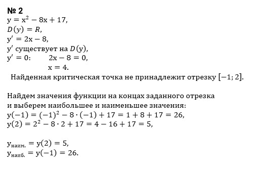 2) Найдите наибольшее и наименьшее значения функции на отрезке: y=x^2-8x+17, x∈ [-1; 2]