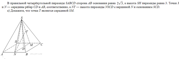 Высота пирамиды - перпендикуляр к плоскости SCD, NT ⊥ пл. SCD ⇒ NT перпендикулярна любой прямой лежащей в этой плоскости, в том числе и прямой SM. ∠ NTS= ∠ NTM=90 ° ⇒ TM ⊥ NT и ST ⊥ NT Из точки T можно провести к NT только один перпендикуляр. T ∈ SM