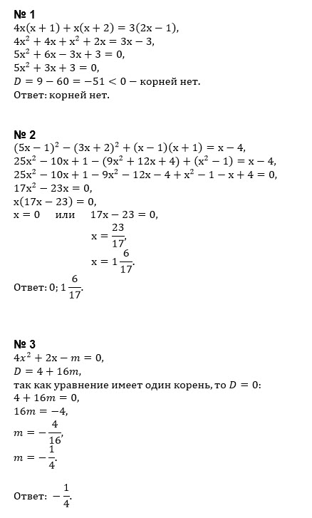 1. Найдите число корней уравнения: 4х(х+1) + х(х+2) = 3(2х–1). 2. Решите уравнение: 5х–1)2– (3х+2)2+ (х–1)(х+1) = х – 4. 3. При каких значениях m уравнение 4х2+2х – m = 0 имеет единственный корень?