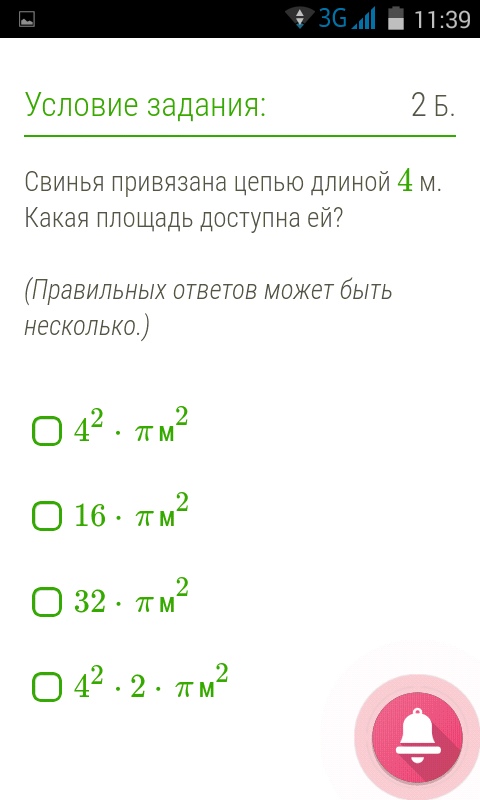 Свинья привязана цепью длиной 4 м. Какая площадь доступна ей? (Правильных ответов может быть несколько.)