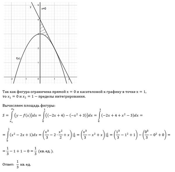 1)Вычислите площадь фигуры, ограниченной графиком функции у=-х^2+3, касательной к этому графику в его точке с абсциссой х=1 прямой х=0.