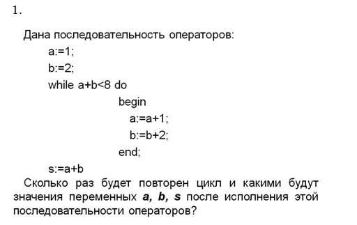 цикл пройдет один раз из-за того что после первого цикла значение а= 2 b=4 а в условии дано то что а+b<8 поэтому s=6, я в этом уверен на 70%