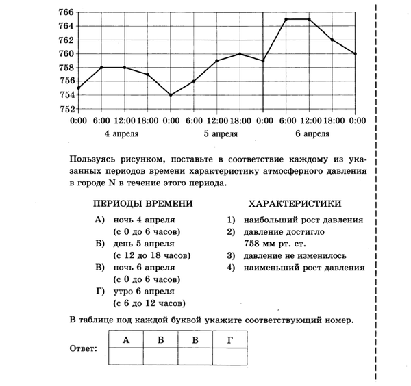 На рисунке точками показано атмосферное давление в городе N на протяжении трёх суток с 4 по 6 апреля 2013 года. В течение суток давление измеряется 4 раза : в 0:00,в 6:00, в 12:00, и в 18:00. По горизонтали указывается время суток и дата, по вертикали – давление в миллиметрах ртутного столба. Для наглядности точки соединены линиями. Пользуясь рисунком, поставьте в соответствие каждому из ука¬занных периодов времени характеристику атмосферного давления в городе N в течение этого периода.