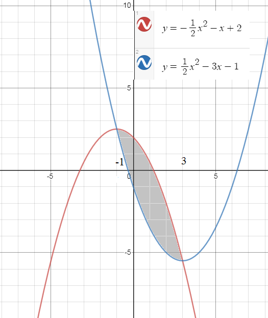 S= ∫ ^(3)_(-1)[b]([/b] (-1/2)x^2-x+2-((1/2)x^2-3x-1)[b])[/b]dx=