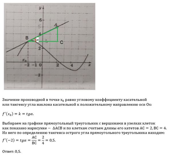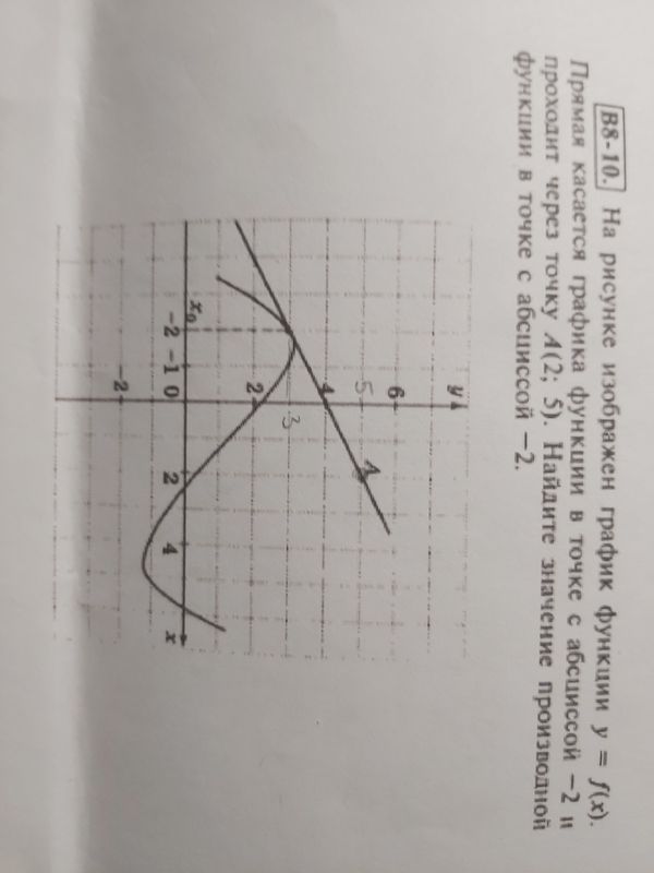 На рисунке изображен график функции у = ƒ(x). Прямая касается графика функции в точке с абсциссой -2 и проходит через точку A(2; 5). Функции в точке с абсциссой -2. Найдите значение производной.