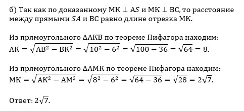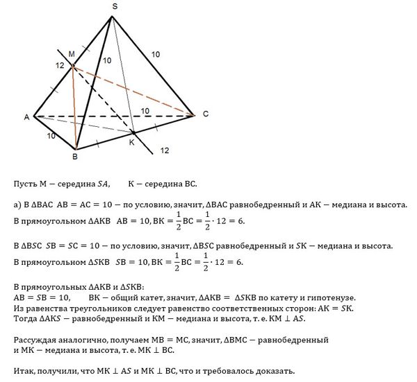 Пожалуйста, помогите решить задачу по стереометрии. в пирамиде sabc известны длины ребер ab=ac=sb=sc=10, bc=sa=12 а) докажите, что прямая, проходящая через середины sa и bc, перпендикулярна sa и bc б) найдите расстояние между sa и bc