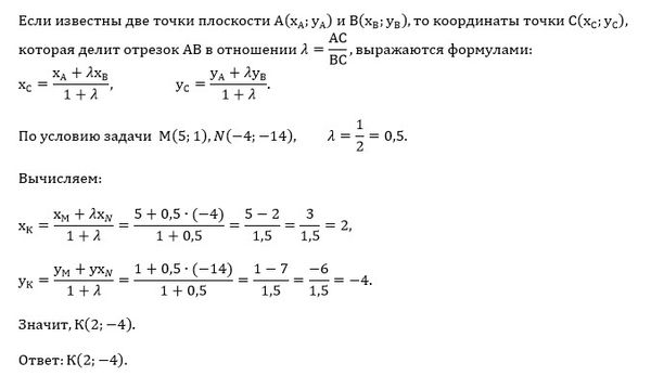 Точка К делит отрезок MN в отношении λ =1/2. Найдите координаты точки К если M(5;1), N (-4;-14). Координата X^(k) равна
