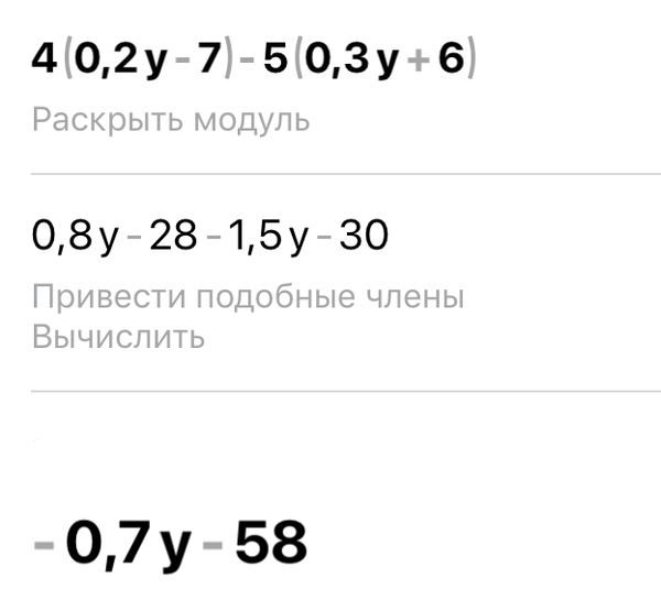 4*(0,2у-7)-5*(0,3у+6)=0,8у-28-1,5у-30=-0,7у-58.