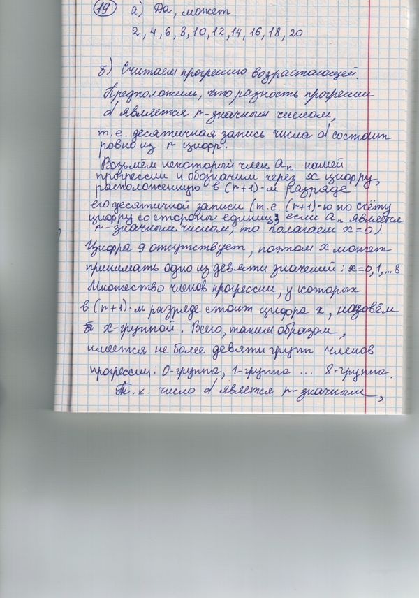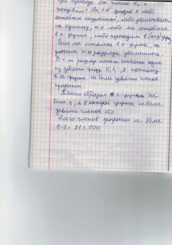 в) При переходе от какого-либо члена последовательности к следующему, то есть при прибавлении числа d, (k+1)-й разряд либо не изменяется, либо увеличивается на 1 (цифра 9 запрещена, поэтому случай изменения разряда с цифры 9 на 0 исключается). Если в прогрессии нет переходов со сменой (k+1)-го разряда, то членов прогрессии не больше 9. Пусть такие переходы есть. Так как цифра 9 запрещена, то их не больше 8. Между двумя такими переходами, а также перед первым и после последнего идут группы (может быть, пустые) переходов без смены (k+1)-го разряда. Всего таких групп – 9.